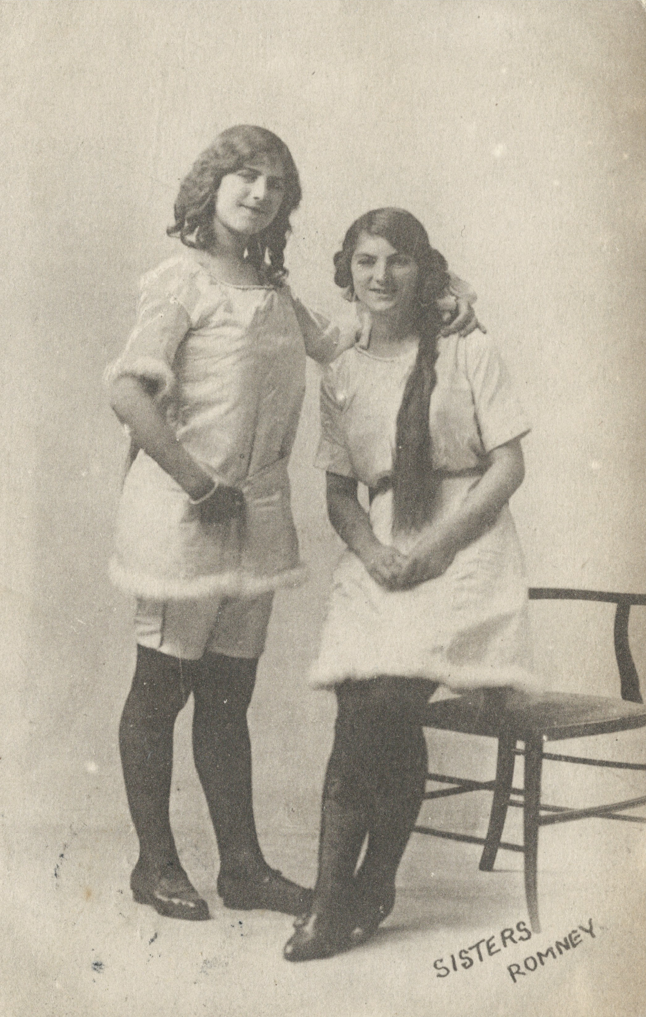 The sender, Bert, writes that he saw the Sisters at Ramsgate Marina Hall at a Smoking Concert held by the town for the soldiers before they departed. He describes them as ‘lovely dancers and singers’ and as sisters, although they could have adopted this as part of their act. The back of the card is a poignant reminder of ordinary lives. Click on the card to read the message.Sisters Romney back