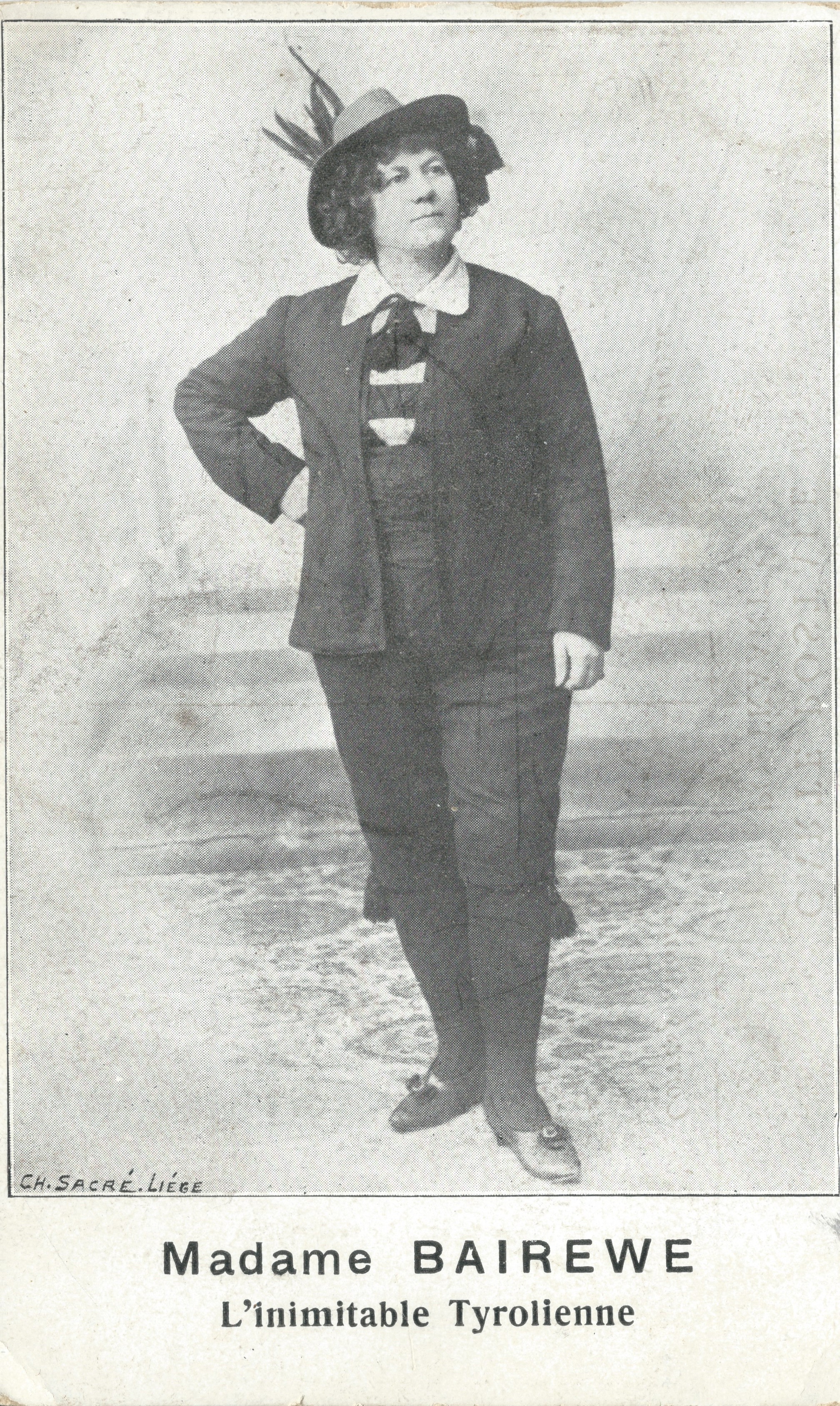 Madame Bairewe is billed as the inimitable Tyrolean on her postcard. I found a mention of her in a newspaper from the Charleroi region in Belgium, dated 31st December 1916. Among the war reports there is an advert for a variety show. We are told the performance starts at 7.30 precisely and ends at 10 ‘very precisely’. The audience will have one hour to get to their homes. Artistes include American eccentrics, comic jugglers, dancers, acrobats and Madame Bairewe, described here as the celebrated Tyrolean. Another newspaper advert from around the same time describes her as a comic.