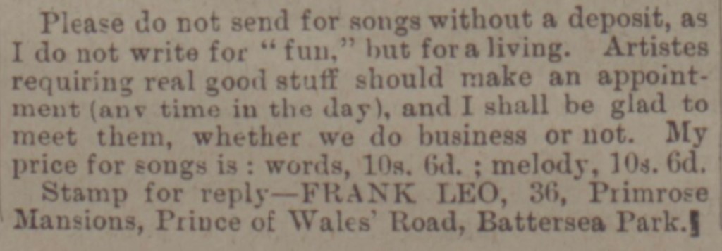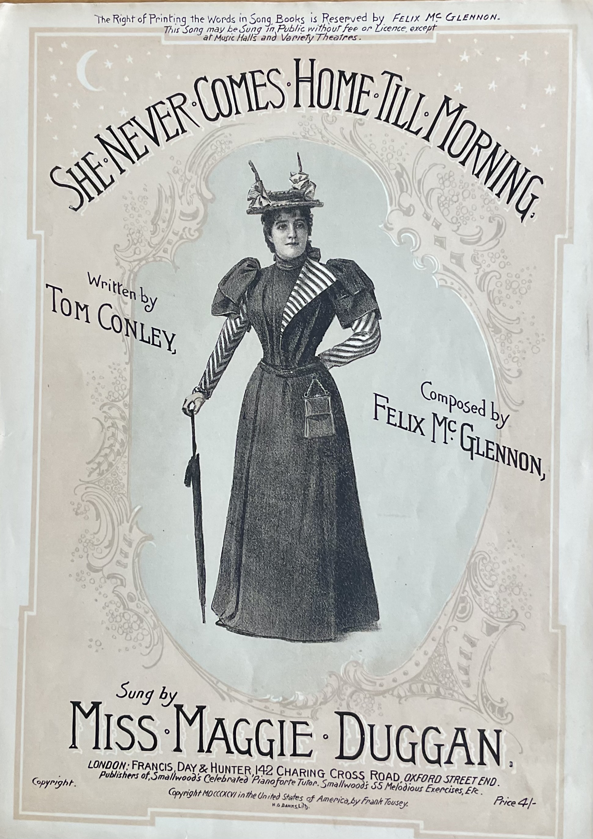 The popularity of these songs may have finally decided Maggie Duggan to switch to music hall, although it wasn’t always easy. She lamented the lack of good songs saying she could buy a hundred and just find one worth singing. In 1900 there is an advert in the Music Hall and Theatre Review placed by Maggie Duggan requesting good low comedy and character songs. She found the lack of rehearsal in music halls equally hard as the band could often be at cross purposes with the singer during a performance. Also, in her previous career she was better known on the provincial stage and worried it would be hard to get work in London halls.