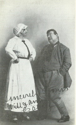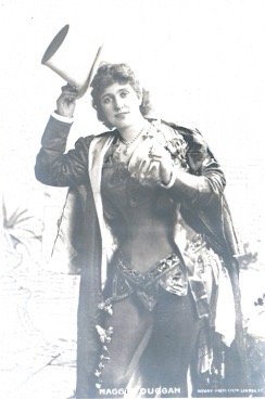 Maggie Duggan excelled in pantomime with her height and build making for an excellent principal boy. She was in demand in Leeds, Manchester, Liverpool and, perhaps best for her career, Drury Lane. Ada Reeve in her autobiography, Take it For a Fact, talks about working with her in Little Boy Blue in 1893. Maggie Duggan played her role as principal boy ‘in the dashing, strutting manner peculiar to those days. Her trademark was a diamond butterfly which she wore pinned to her tights on her thigh.’